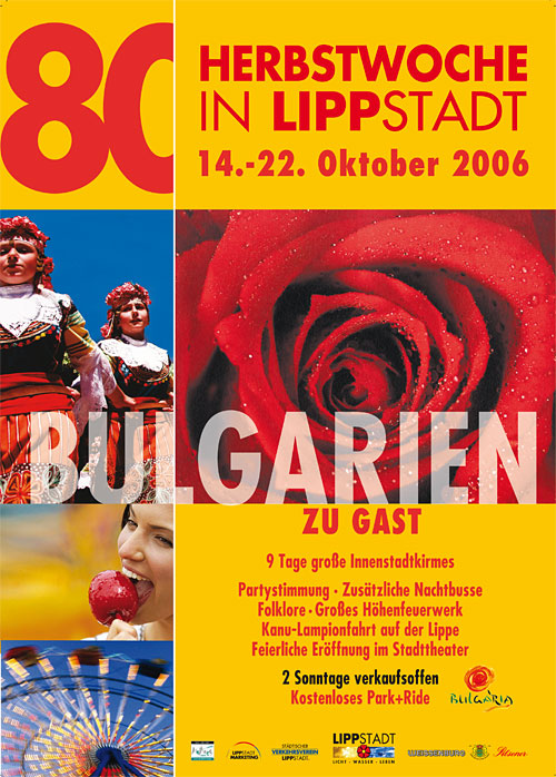 Erleben Sie vom 14. - 22. Oktober 2006 die große Innenstadtkirmes mit vielen Highlights und den verkaufsoffenen Sonntagen am 15. und 22. Oktober von 13.00 bis 18.00 Uhr! Dieses Jahr ist Bulgarien zu Gast in Lippstadt.