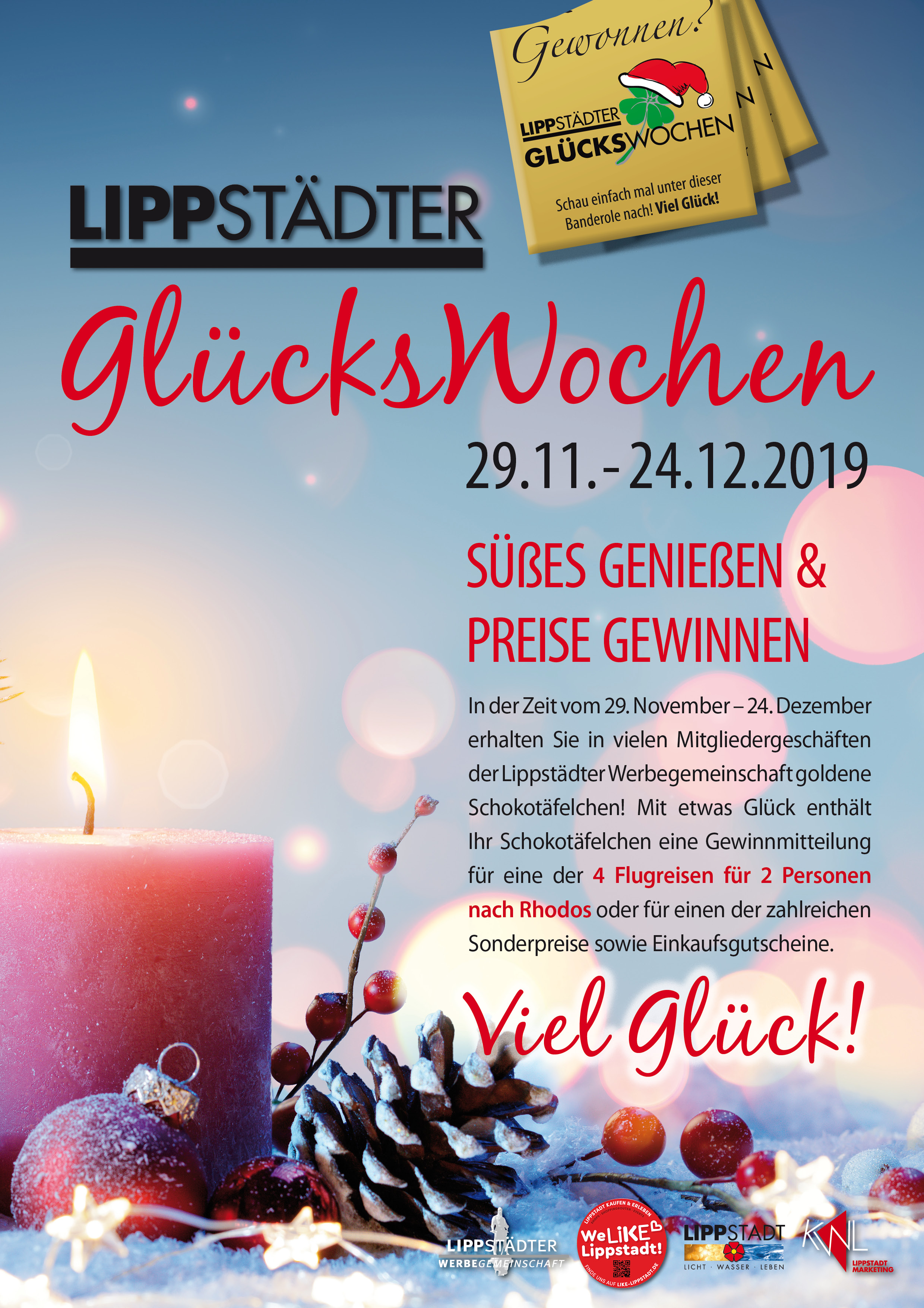 In der Zeit vom 29. November – 24. Dezember erhalten Sie in vielen Mitgliedergeschäften der Lippstädter Werbegemeinschaft goldene Schokotäfelchen! Mit etwas Glück enthält Ihr Schokotäfelchen eine Gewinnmitteilung für eine der 4 Flugreisen für 2 Personen nach Rhodos oder für einen der zahlreichen Sonderpreise sowie Einkaufsgutscheine.