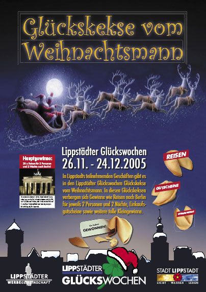 Glückskekse vom Weihnachtsmann!! Machen Sie mit bei den diesjährigen Lippstädter Glückswochen und gewinnen Sie tolle Preise!! In Lippstadts teilnehmenden Geschäften gibt es in der Zeit vom 26.11. - 24.12.2005 Glückskekse vom Weihnachtsmann. In diesen Glückskeksen verbergen sich Gewinne wie Reisen nach Berlin für jeweils 2 Personen, mit zwei Übernachtungen, inklusive einer Stadtrundfahrt. Weitere Einkaufsgutscheine, sowie tolle Kleingewinne! Wir wünschen - viel Glück!!