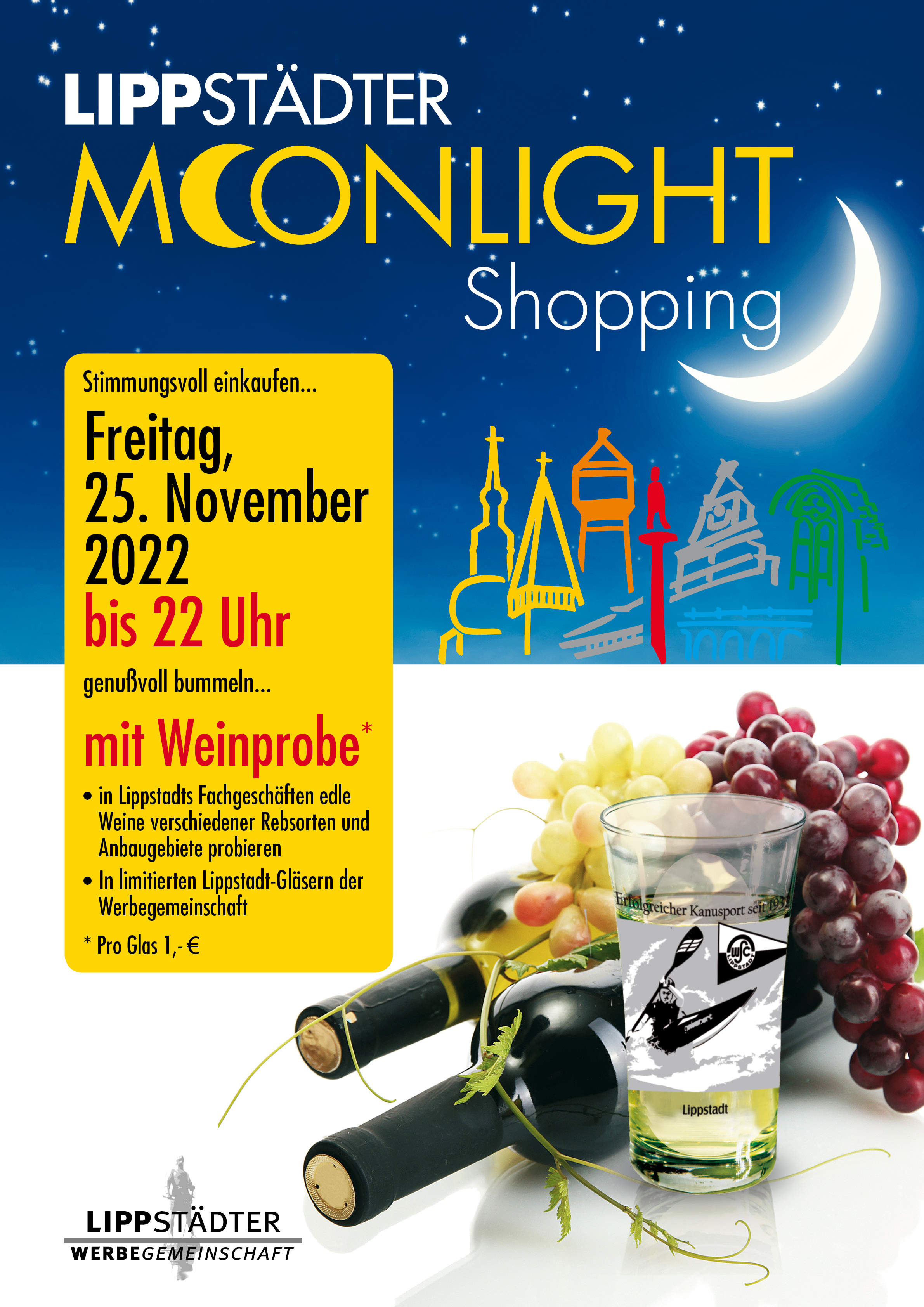 Zum Moonlight Shopping könnt ihr stimmungsvoll in einer festlich beleuchteten Stadt bis 22:00 Uhr einkaufen und wieder leckere internationale Weine in den teilnehmenden Geschäften verkosten - natürlich in den beliebten Sammelgläsern mit neuem Motiv. Lasst euch überraschen!