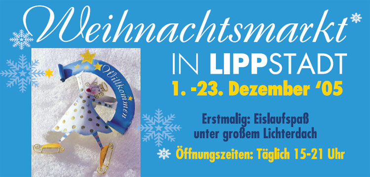 vom 01. - 23. Dezember 2005 Erleben Sie erstmalig eine Eislaufbahn auf dem neu gestalteten Lippstädter Weihnachtsmarkt unter dem großem Lichterdach. Täglich öffnet sich ein Fenster des kunstvollen Adventskalender in den Rathausfenstern! Genießen Sie die stimmungsvolle Atmosphäre täglich von 15.00 - 21.00 Uhr!