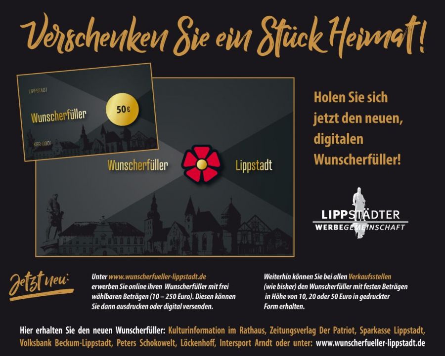 Desweiteren kann der neue digitale Wunscherfüller rund um die Uhr im Internet unter www.wunscherfueller-lippstadt.de mit frei wählbaren Beträgen zwischen 10 und 250,- € generiert, bezahlt und per whatsapp, e-mail oder Messenger versendet werden. Und: selber ausdrucken geht natürlich auch.