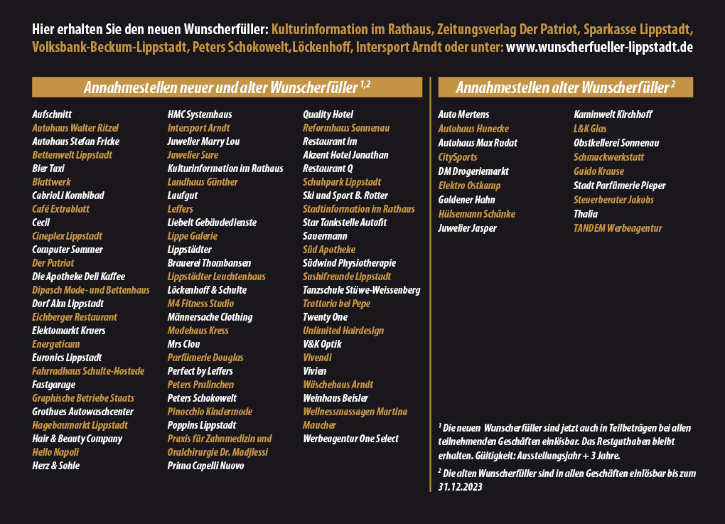 Der Wunscherfüller ist bei den Lippstädter Sparkassen und Volksbanken, bei der Stadtinformation am Rathaus, der Patriot Geschäftsstelle am Markt, Sporthaus Arndt, Fahrrad Löckenhoff, sowie Peters Schokowelt erhältlich. Hier bekommen Sie Wunscherfüller in gedruckter Form in Höhe von 10,-, 20,- und 50,- €. Der Wunscherfüller kann bei allen teilnehmenden Händler auch in Teilbeträgen eingelöst werden. Die Restguthaben bleiben selbstverständlich erhalten und können in weiteren Geschäften eingelöst werden!
